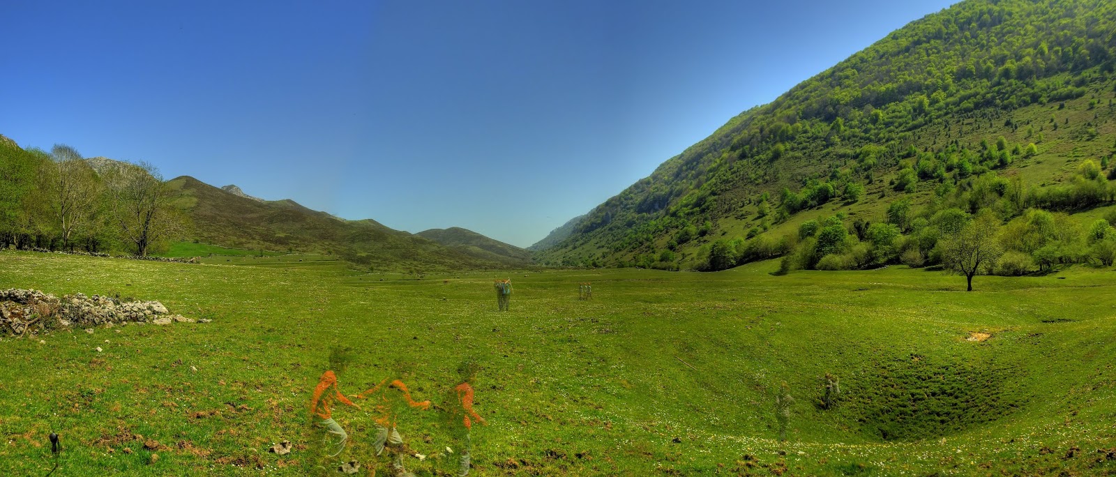 ...llegamos al inmenso prau de la Llosa de Viango, es de un tamaño colosal, y sorprendió a todos los presentes, algunos con 40 años de experiencia pateando monte por Asturias; hay pocas cosas iguales a ésta. Los críos, que iban reventados y desanimados, nada más ver el panorama revivieron y se dedicaron a explorar la salvajada de paisaje que se abría ante nuestros ojos.